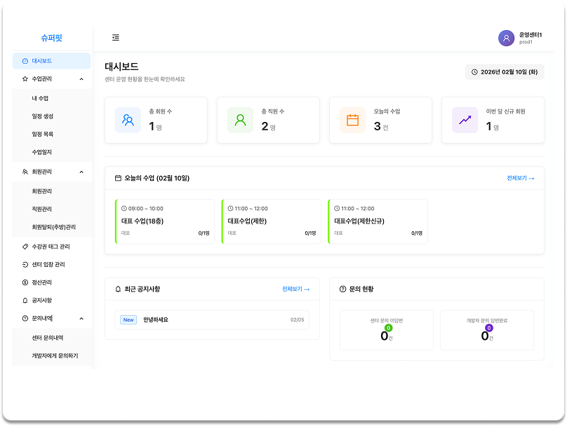 오늘의 수업, 회원 현황, 최근 가입 회원을 한눈에